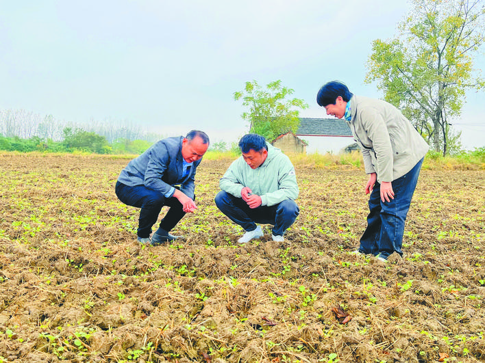 肥东县农技人员下地查看油菜种植情况。