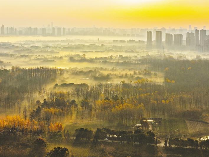11月24日清晨,董铺湿地仿佛被一层轻纱笼罩着,平流雾如梦幻般地萦绕在水面与岸边,如同大自然挥洒的水墨。当太阳缓缓升起,金色的阳光穿透云层,光线与平流雾相互交融,形成奇妙的光影效果。通讯员 李中蒙 摄