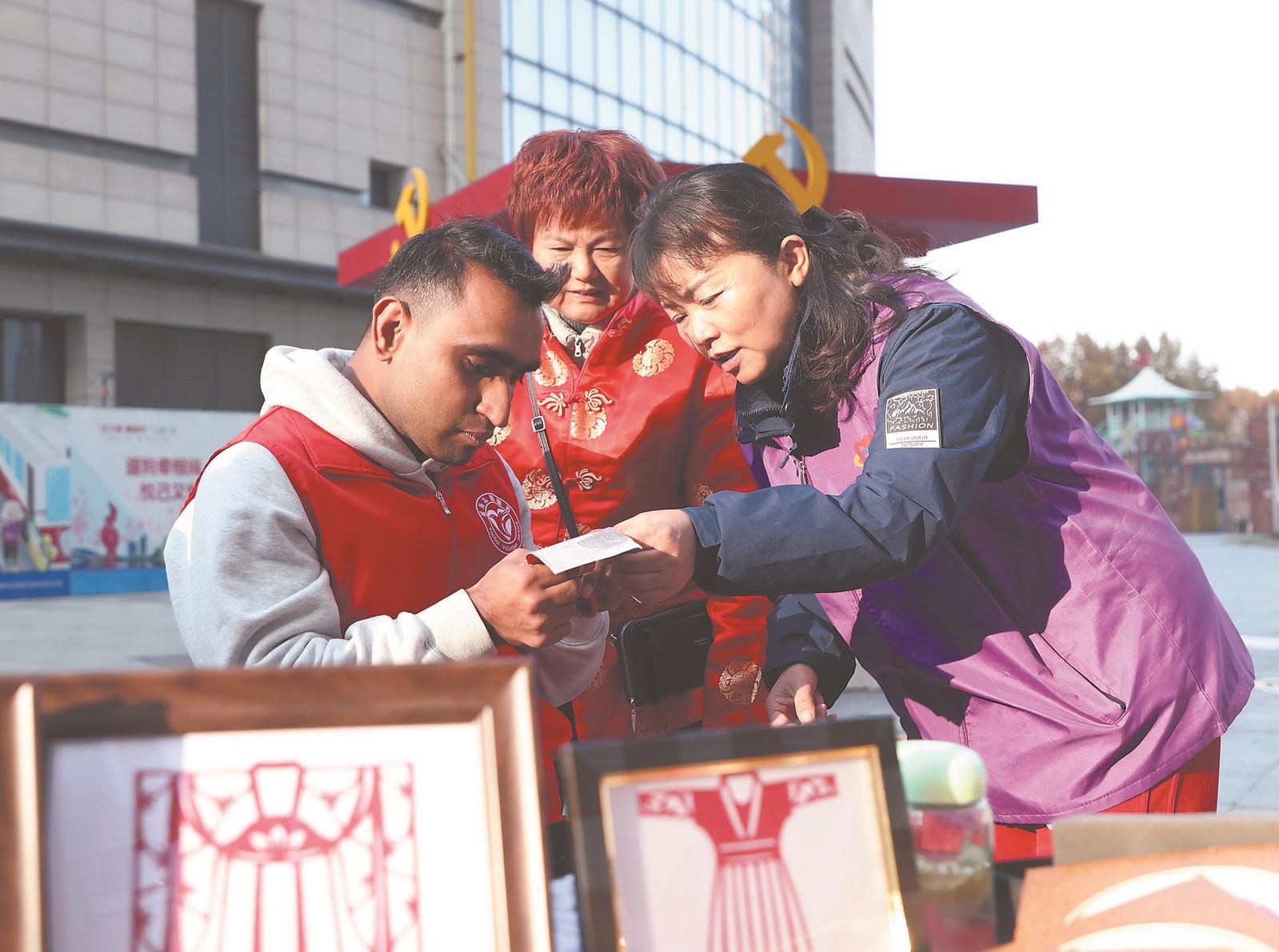 12月5日,安徽省暨合肥市2025年国际志愿者日志愿服务交流展示活动在志愿服务项目孵化基地(安徽)举办。图为外国留学生在活动现场向瑶海大姐志愿服务队学习中国剪纸。记者 李季 摄