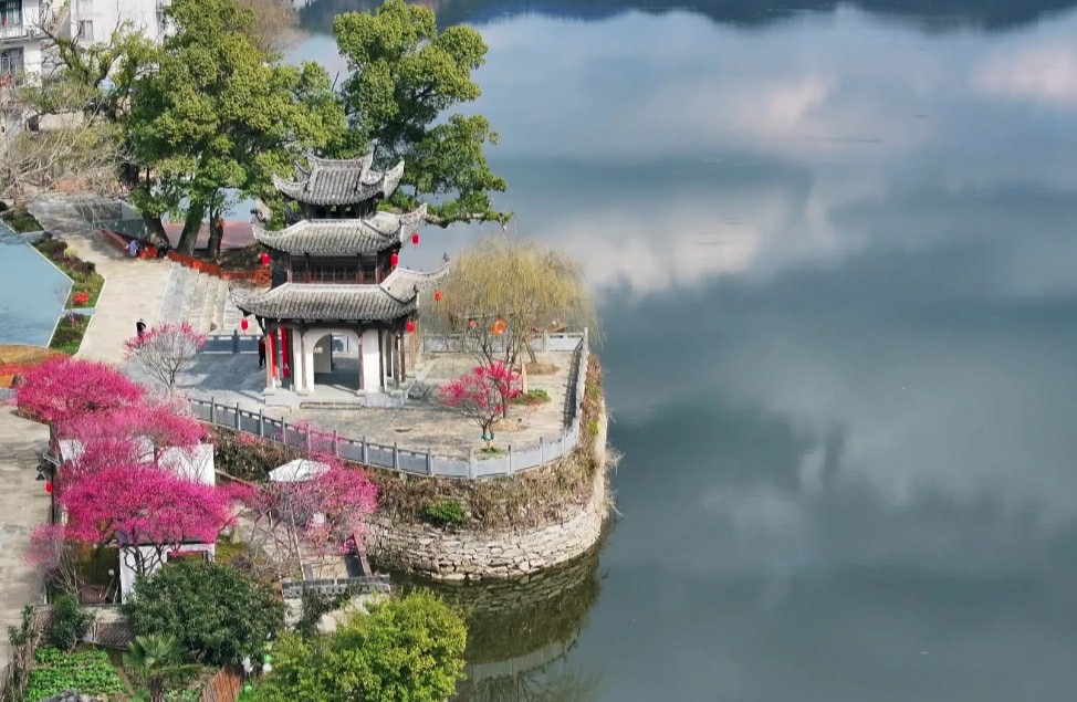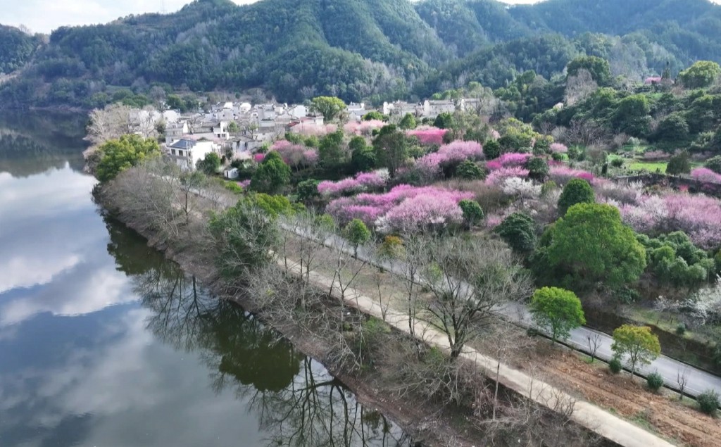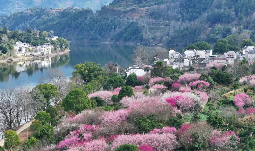 在春阳的温柔抚摸下,秀丽的江水闪烁着点点银光,宛如一条流动的玉带。岸边,各式梅花竞相绽放,红的、粉的、白的,交织成一片绚烂的花海,散发着淡淡的芬芳。远处,青山如黛,层峦叠嶂,被春天的气息染上了或深或浅的绿意,云雾缭绕其间,时隐时现,宛如仙境。山脚下,徽派民居错落有致,白墙黛瓦,古朴中透着雅致,与周围的自然风光和谐共生,让人心旷神怡,沉醉在这份宁静与美好之中。