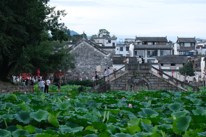 6月25日,天朗气清,走进呈坎古村,永兴湖中莲叶接天,含苞待放的荷花点缀其间。游客们或乘竹筏穿行荷间,体验“误入藕花深处”的诗意;或驻足青石板桥上,用镜头记录“水面清圆,一一风荷举”的灵动。