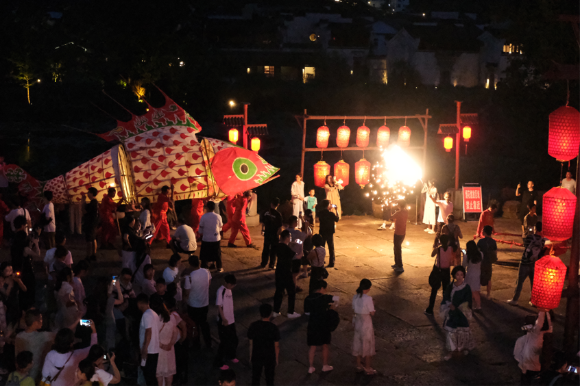 暮色降临,鱼灯夜游活动热闹上演,游客们开启一场徽州夏夜奇幻之旅。在夜色中,一盏盏惟妙惟肖的徽州鱼灯沿青石板路次第游走,灯影随鼓点上下翻飞,如梦似幻。游客们不仅能观赏,还可以举着鱼灯跟随队伍漫步青石板巷,参与到“人在画中游,鱼从画里来”的沉浸式体验中。