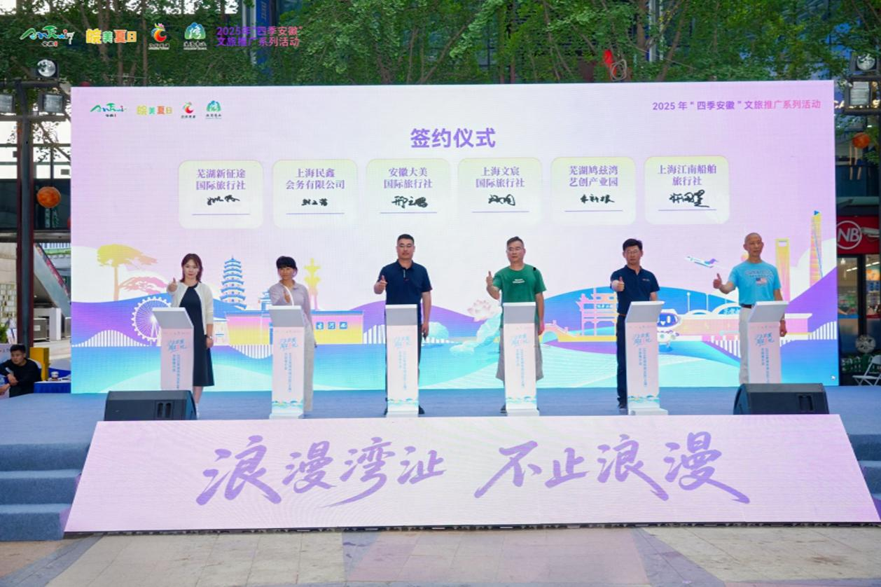 此外,上海芜湖两地6家旅行商签署合作协议,深化旅游合作。同日举行的沪皖文旅专题洽谈会汇集两地行业协会、旅行商、文旅企业及景区代表,围绕产品开发、资源共享、联合营销等方面深入交流,共商长三角文旅合作新模式。活动最后,两地代表共同开启芜湖市2025夏季文旅惠民消费季。