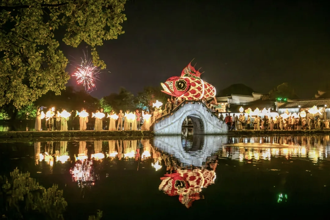 此外,黟县古城围绕“月圆映国庆”主题,举办“古韵承新 礼赞祖国”国庆晚会,歌舞、戏曲、朗诵轮番登台,热闹非凡;秀里景区的鱼灯巡游灵动鲜活,碧山村的《言碧有物》乡村故事展温情脉脉,为游客提供多元文化体验。
