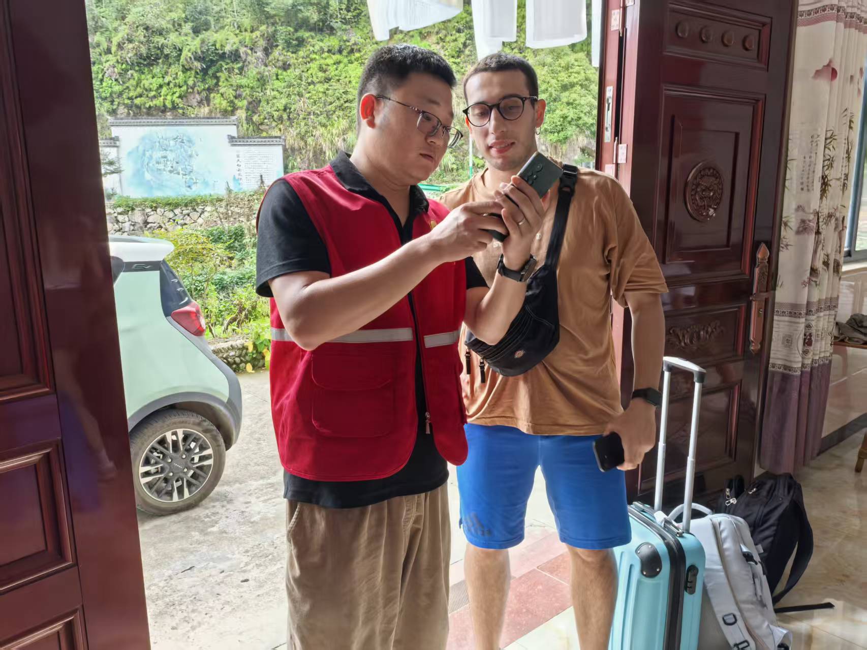 得知意大利游客抵达,白际乡志愿服务点工作人员立即上前接应。考虑到境外游客登记需求,志愿者引导游客出示护照,逐一核对姓名、签证有效期、入境口岸等信息,细致录入住宿登记系统,并同步介绍白际乡优美的自然风光,全程高效且耐心。在路线咨询环节,志愿者结合意大利游客的行程安排和偏好,推荐了严池高山古村落、人民公社、百丈冲瀑布等旅游打卡景点,同时针对他们对当地文化的兴趣,还重点介绍了白际人民公社旧址的历史背景,让国外游客在赏景之余读懂乡村底蕴。此外,志愿者还介绍了红薯干、高山茶等特色农产品,民宿经营者还安排体验农家特色美食,意大利游客纷纷表示,白际的原生态风光与贴心服务令人难忘,会把这个“云端上的秘境”分享给更多欧洲朋友。