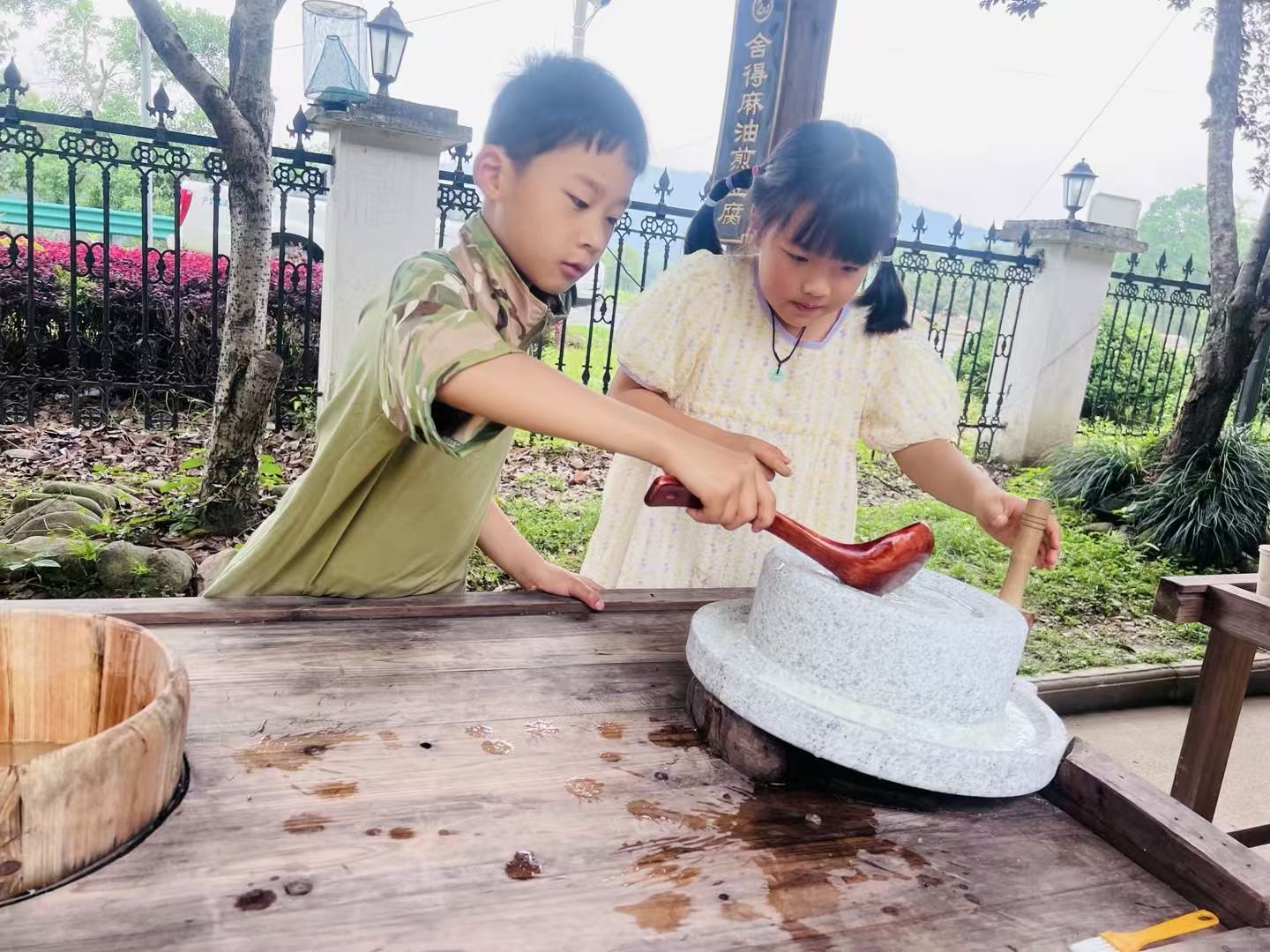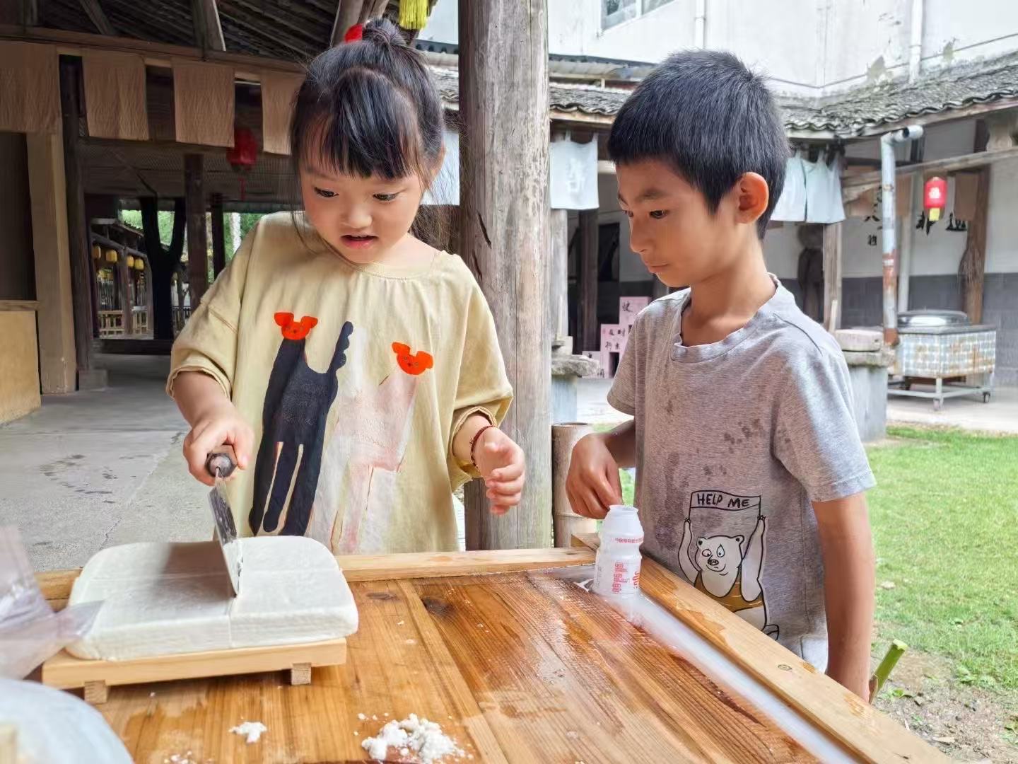 佳龙豆腐文化园景区拥有徽州豆腐博物馆、非遗市集、豆棚闲话食坊与制作工艺展示工厂等多元场景,打造了“从一粒黄豆到一块豆腐”的全链条研学之旅。研学现场,孩子们握紧石磨木柄慢慢转动,吱呀转动中研磨本地“六月黄”黄豆,当滴入卤水,豆浆在眼前逐渐凝结成嫩豆腐时,现场满是孩子的惊叹声。捧着自己做的热乎豆腐,再喝上一杯现磨豆浆,非遗传承人还在现场演示卤水点浆、手工包扎等传统技艺,游客和家长们忍不住拍照分享:“这里比课本生动许多,孩子全程专注又兴奋!”