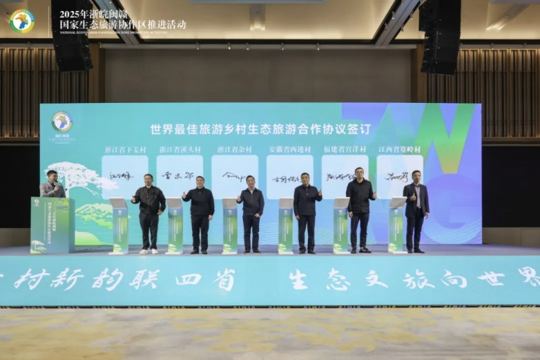 在全场嘉宾的共同瞩目与热烈掌声中,安徽省西递村、浙江省下姜村、溪头村、余村及江西省篁岭村、福建省官洋村等6家“世界最佳旅游乡村”代表共同签署了生态旅游合作协议;四省省级旅游协会共同签订了入境游合作框架协议,携手开拓国际市场。