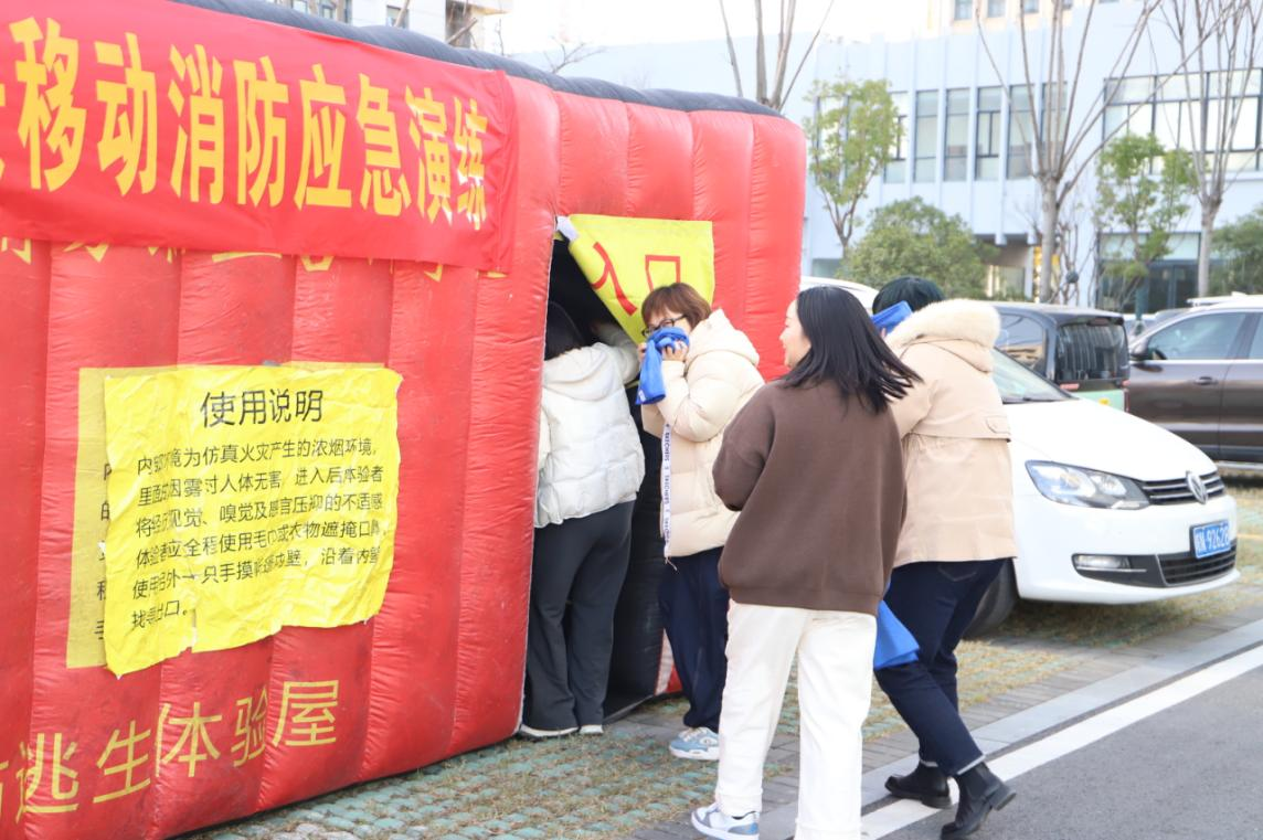 随着消防警报响起,逃生演练随即展开。办公区域内浓烟弥漫,员工们在安全员的引导下,用湿毛巾捂住口鼻,弯腰低姿,沿着预定疏散路线快速有序撤离,仅用3分钟便全部抵达室外安全区域。随后的逃生舱模拟逃生实操中,大家进入模拟浓烟环境的逃生舱,在能见度极低的条件下,凭借对逃生技巧的掌握和现场指引,成功完成逃生任务,进一步提升了复杂环境下的应急避险能力。