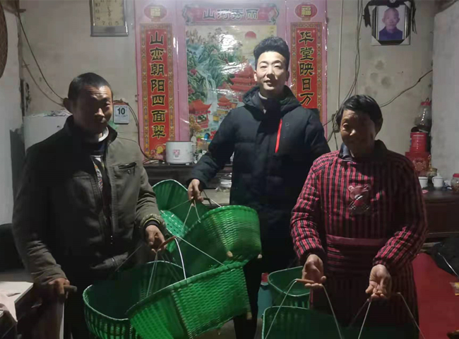 1月10日下午,安徽涵睿建筑工程有限公司相关负责人到黄山市黄山区仙源镇龙山村脱贫户齐应当的家中,购买了40个手工编制的竹篮。