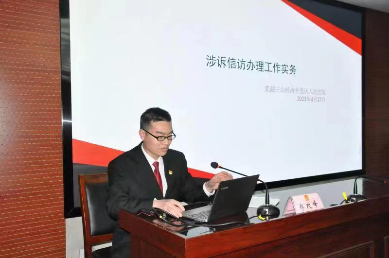 4月27日下午,芜湖三山经济开发区人民法院党支部举办“促学习、提能力,做好新时代法院信访工作”主题党日活动。院领导班子成员以普通党员身份参加活动,全体党员干警、员额法官、法官助理、书记员参加活动。