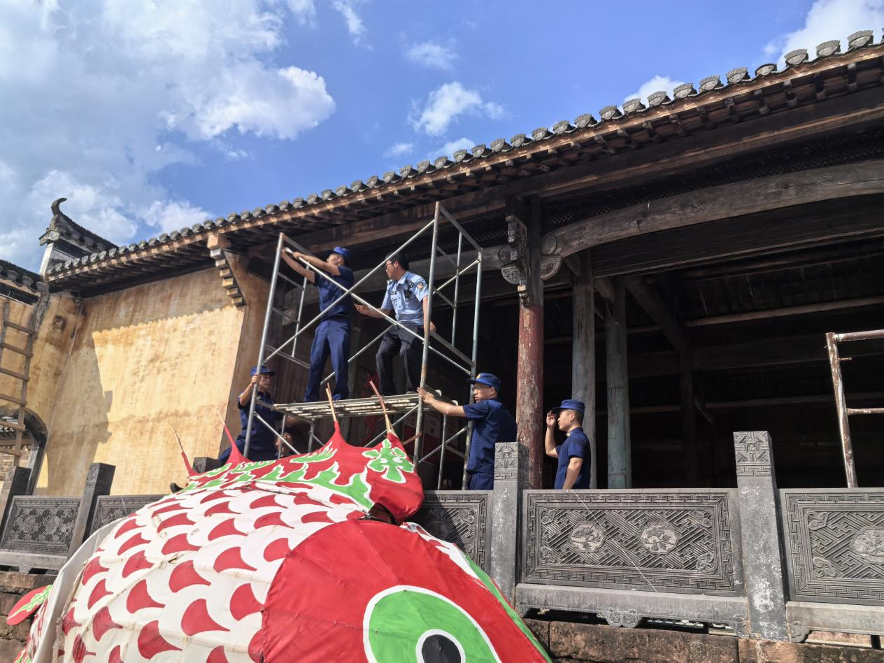 接到派出所的联络后,消防部门迅速调派骨干队员及轻型救援装备赶到现场。消防队员抵达后,与民警、景区工作人员共同会商救援方案:考虑到房屋周边空间狭窄,大型救援设备无法进场,最终确定采用搭建轻型脚手架的方式开展作业。“脚手架的搭建得‘轻手轻脚’,每一根杆件都要避开房屋的木构件和瓦当,哪怕蹭掉一点漆、碰坏一片瓦都不行。”参与救援的消防队员说,现场人员分工细致——民警负责维持周边游客秩序,避免人群拥挤影响救援,还时不时走到李先生身边同步反馈进展,缓解他的焦虑;消防队员小心翼翼地搭建脚手架;景区工作人员则全程在旁协助,提醒注意房屋结构特点。