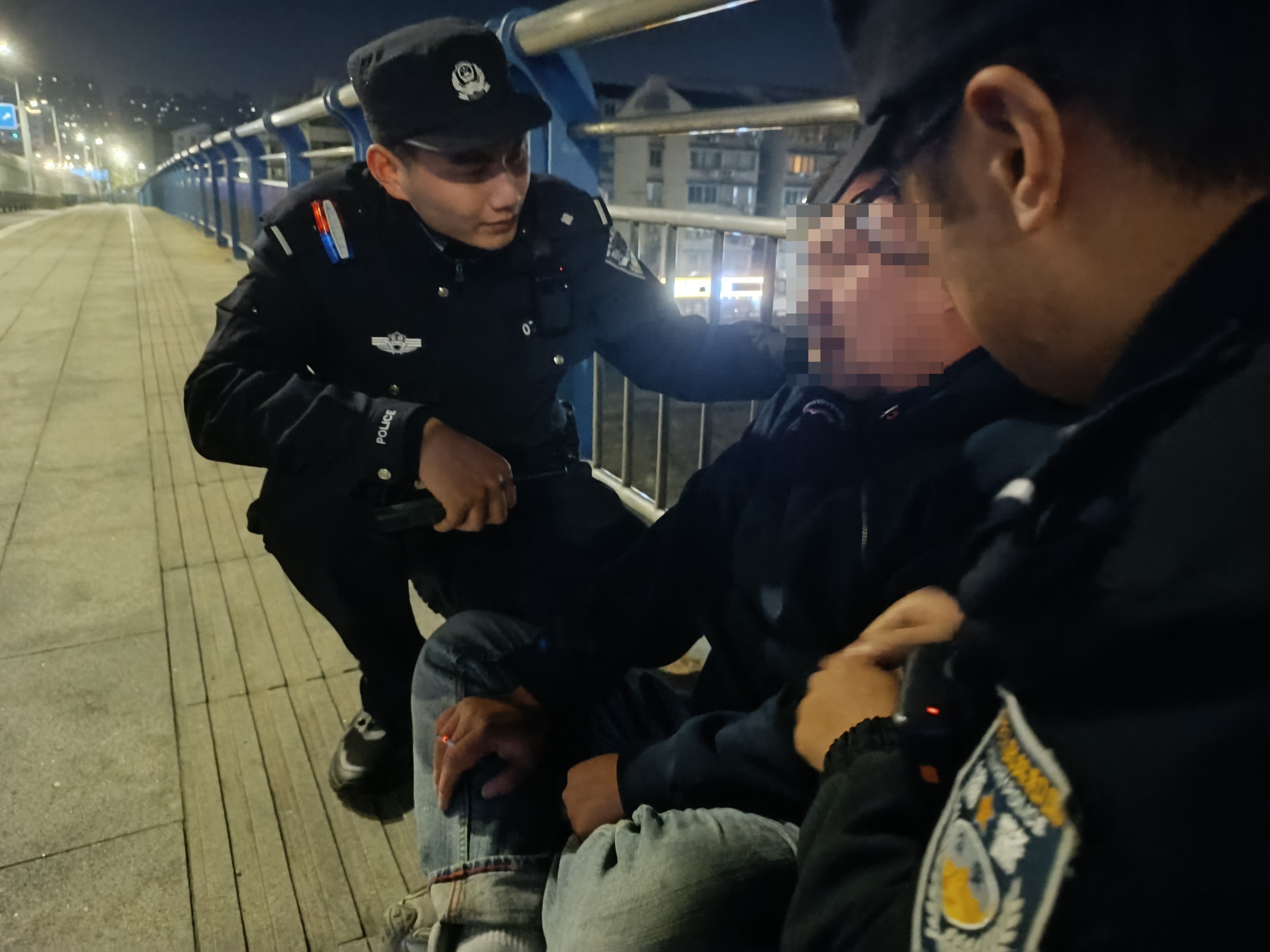 警灯划破夜幕,不到6分钟到达中江桥。经搜寻,在大桥的中段发现了惊险一幕——寒风中,一名男子蹲在桥边,身体探出护栏,面向江水失声痛哭,随时可能跳桥轻生。