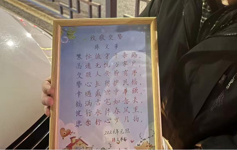 寒冬执勤岗,诗暖交警心。这份特殊的新年礼物,承载的不仅是群众对交警工作的理解与认可,更映照出警民同心的深厚情谊。繁昌交警的坚守与担当温暖了城市出行路,而群众的暖心回馈则为这份坚守注入了温情力量,成为元旦假期里警民鱼水情的生动注脚。(金伟)