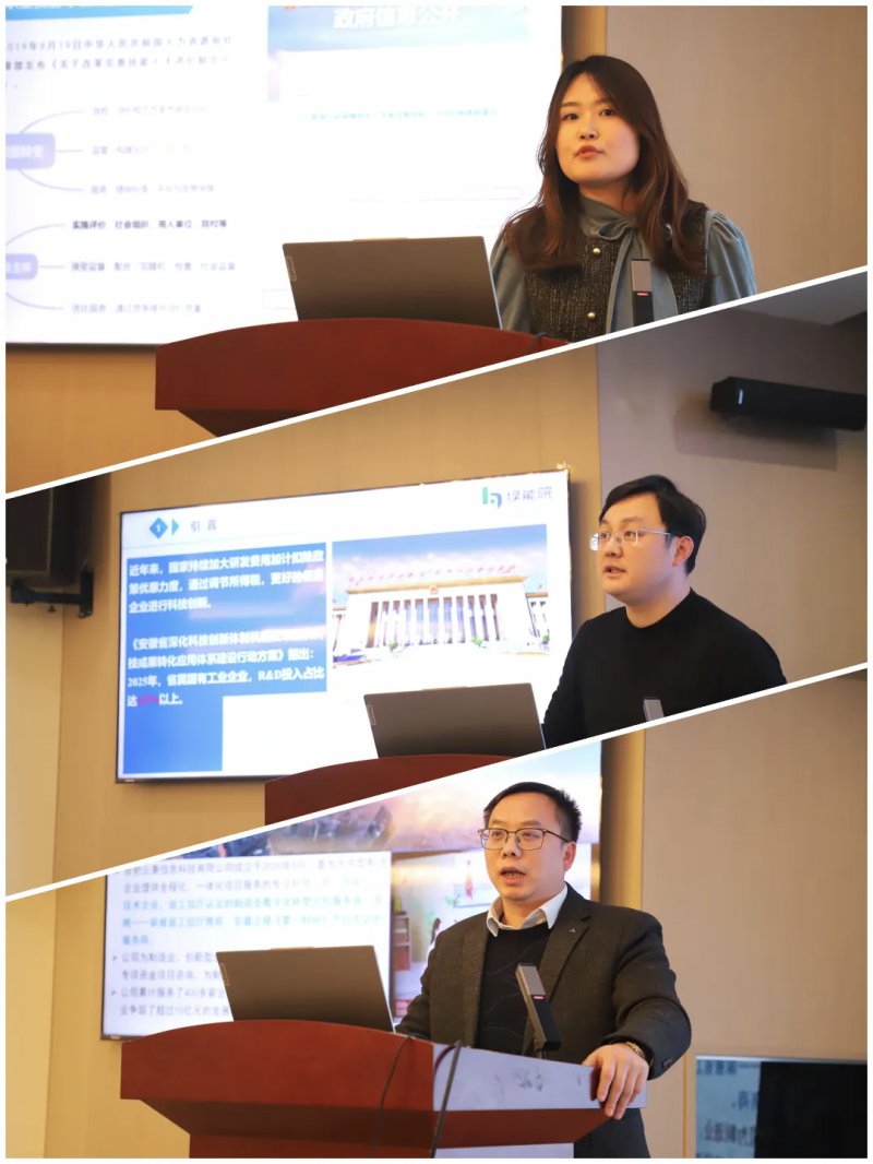 会上,安徽工经联职业技能评价办公室陈倩解读了赋能新质生产力、培育高技能人才的相关政策,介绍了在开展人工智能训练师、区块链应用操作员等工种职业技能等级评价工作中,精准对接服务、全程赋能助力的做法,以及携手共建合作、共赢美好未来的愿景。安徽工经联科技成果评价中心、安徽绿能技术研究院执行院长卞国琛围绕企业研发创新体系标准化建设,解读了相关政策要求,分享了相关解决方案和服务案例。合肥云秉科技有限公司技术总监谭小伟博士解读了国家发展改革委、财政部《关于加力支持大规模设备更新和消费品以旧换新的若干措施》和省政府办公厅《支持以数字化转型推动制造业高端化智能化绿色化发展若干政策》,并分享了相关服务案例。
