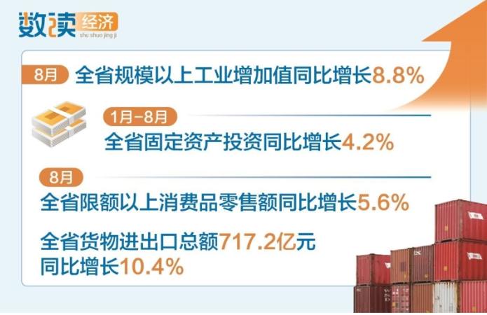 从进出口来看,8月的数据表现良好。全省货物进出口总额717.2亿元,同比增长10.4%,比7月份加快7.7个百分点。其中,出口增长6.4%,进口增长18.7%。