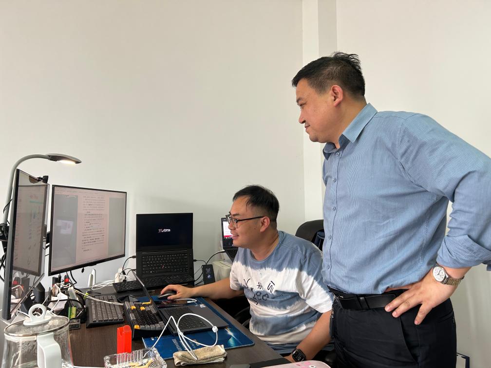 安徽大学物质科学与信息技术研究院研究员王绍良(右一)在办公室工作。新华社记者吴慧珺 摄
