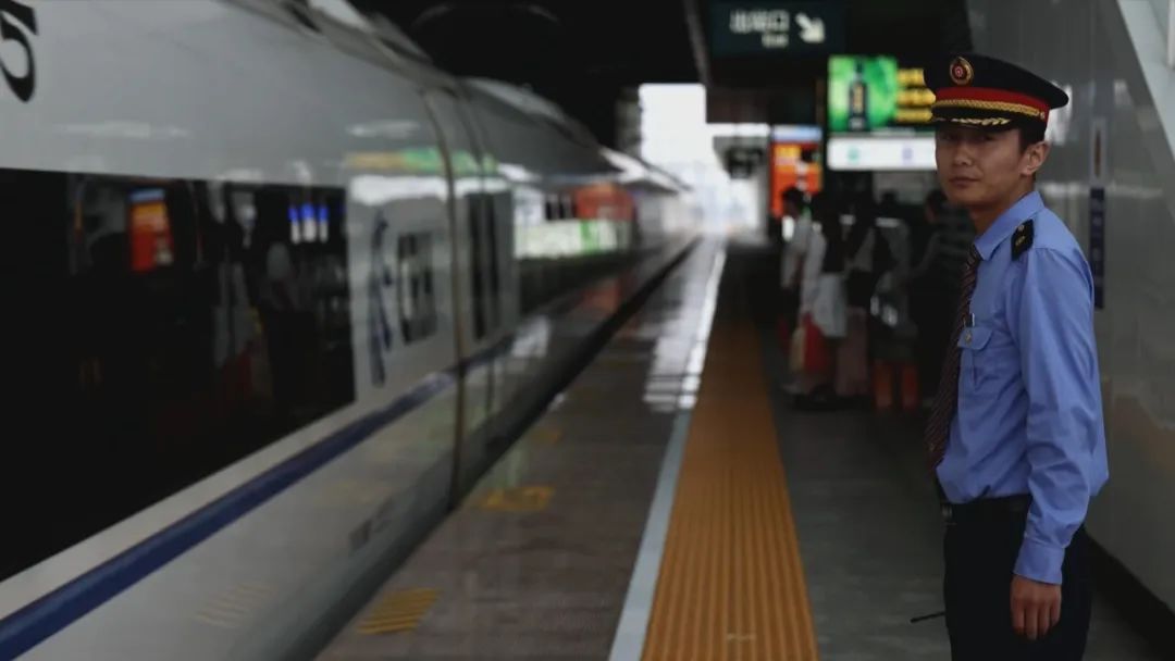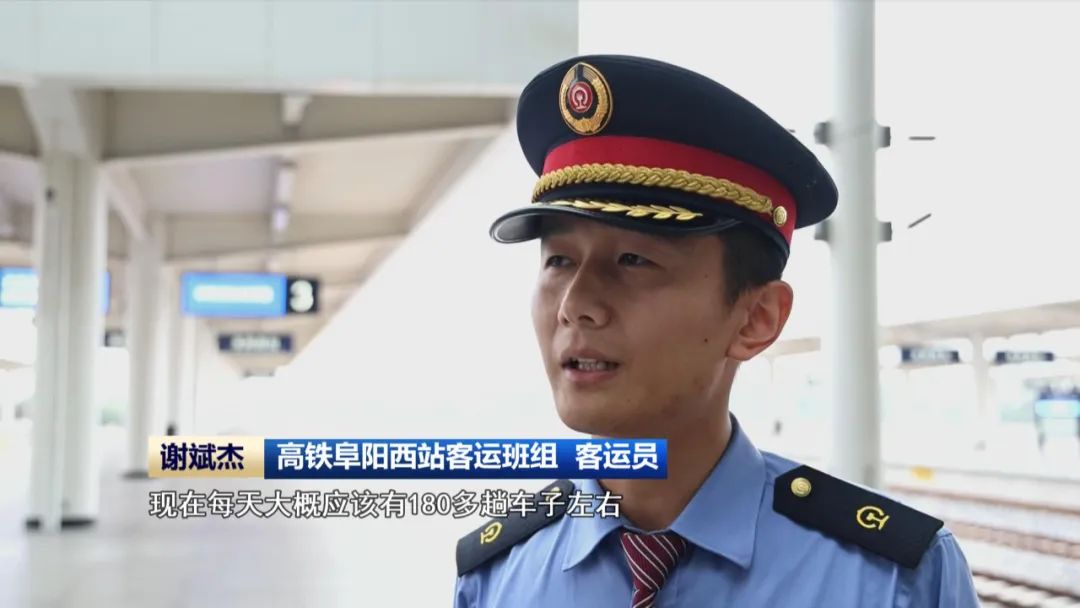 晚高峰,列车到站,在阜阳西站,客运班组的站台客运员谢斌杰正忙着组织旅客上下车。在相距不到一百米的售票班组,谢斌杰的妻子张雪微忙着为旅客查看车次、办理改签。小两口已经连续四年间坚守国庆假期。