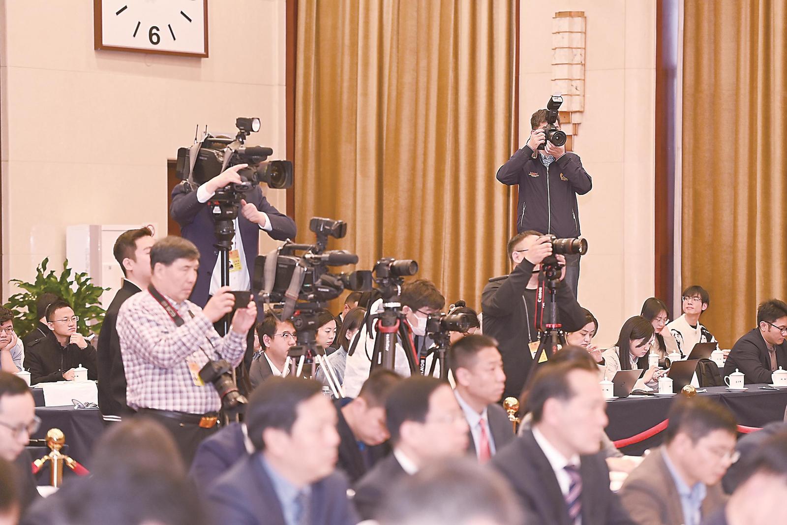3月6日下午,在安徽代表团住地会议厅里,52家境内外媒体、85名记者参加开放团组会议。 杨竹 摄