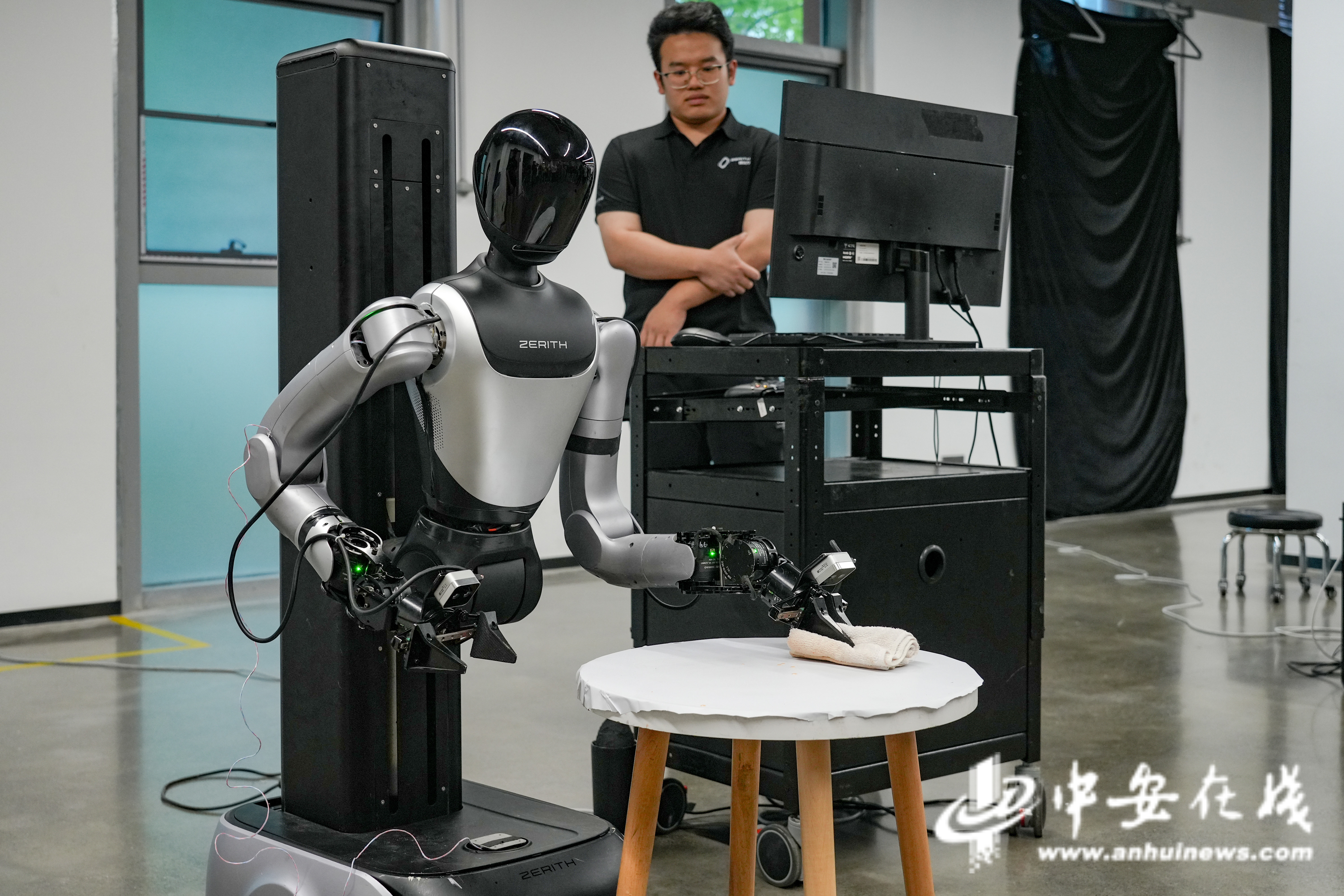 在合肥零次方机器人公司,轮臂人形机器人Zerith H1可执行拿取、叠衣、打扫等复杂任务,展现出机器人管家的优秀潜质。