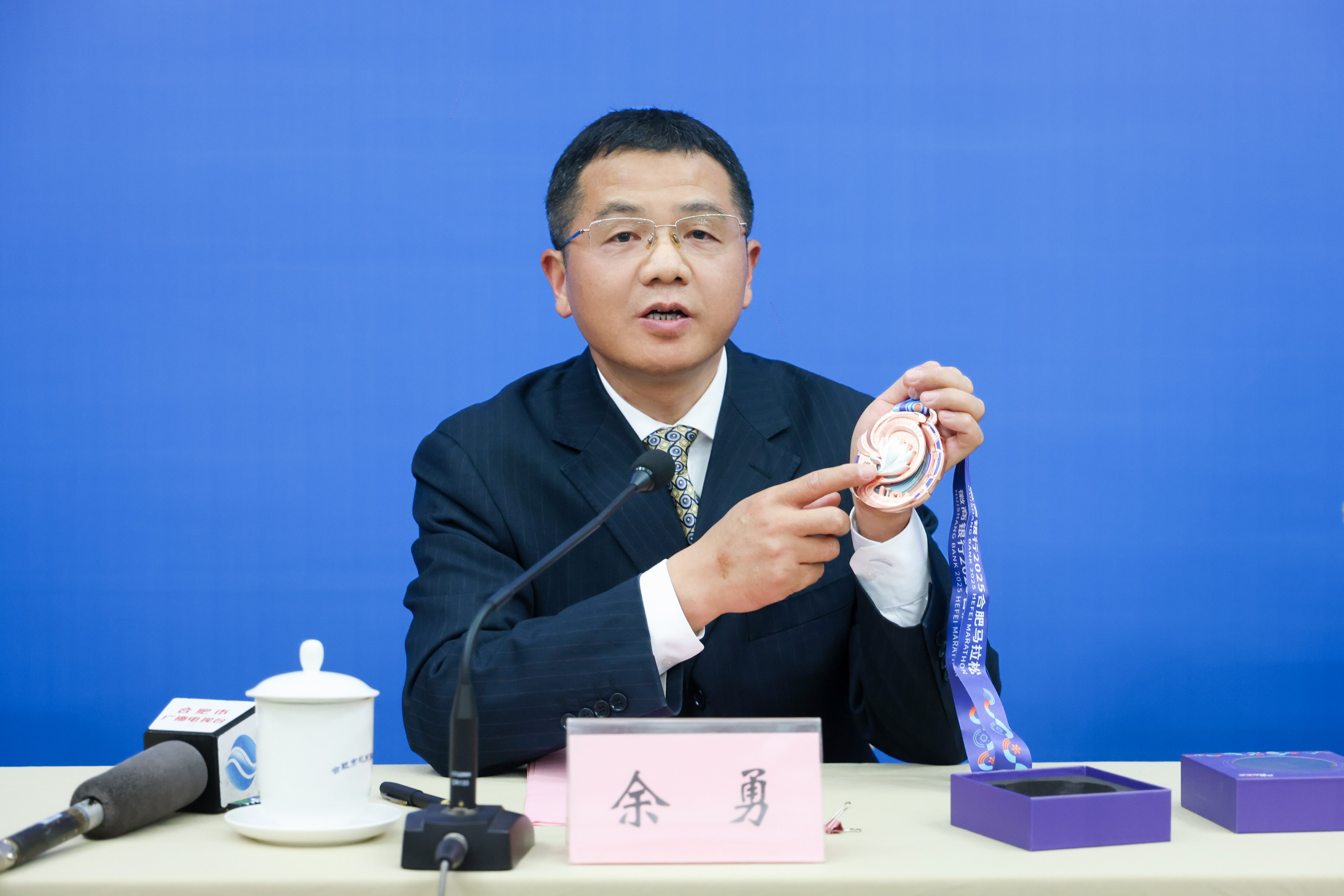 合肥市体育局局长余勇向媒体介绍2025合肥马拉松完赛奖牌
