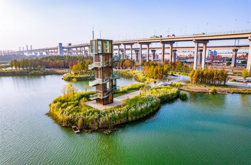朱家桥尾水净化生态公园位于芜湖市镜湖区西北部,紧邻长江。这里曾是长江大桥桥下的闲置地带,杂草丛生、水体黑臭,是城市中一块被遗忘的“边角料”。