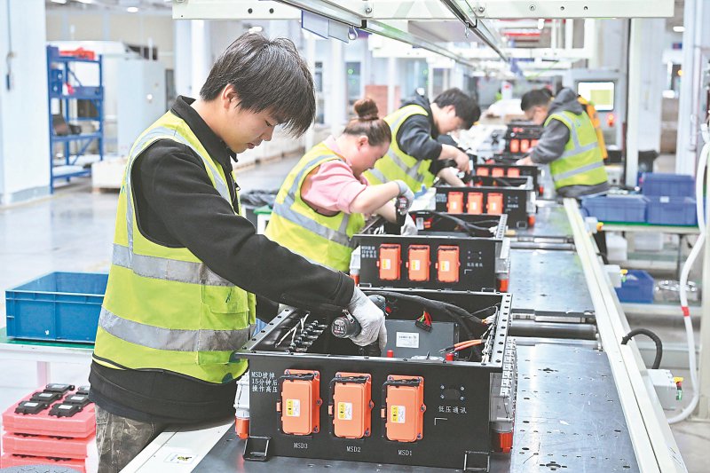 4月13日,科大国创新能科技有限公司生产车间,工人在新能源汽车电池包组装生产线上作业。本报记者 程兆 摄