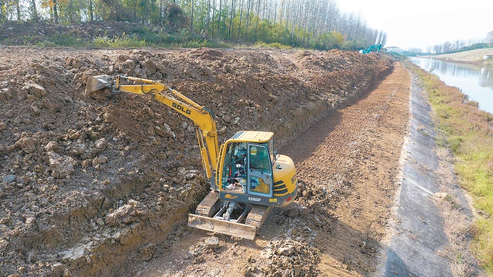 近日,合肥市蜀山区高刘街道,工人驾驶机械实施淠河总干渠下段切岭段整治项目。目前,安徽省淠史杭灌区积极组织开展冬修水利工作,为农业丰产丰收和防洪抗旱打牢基础。通讯员 蒋常虹 摄