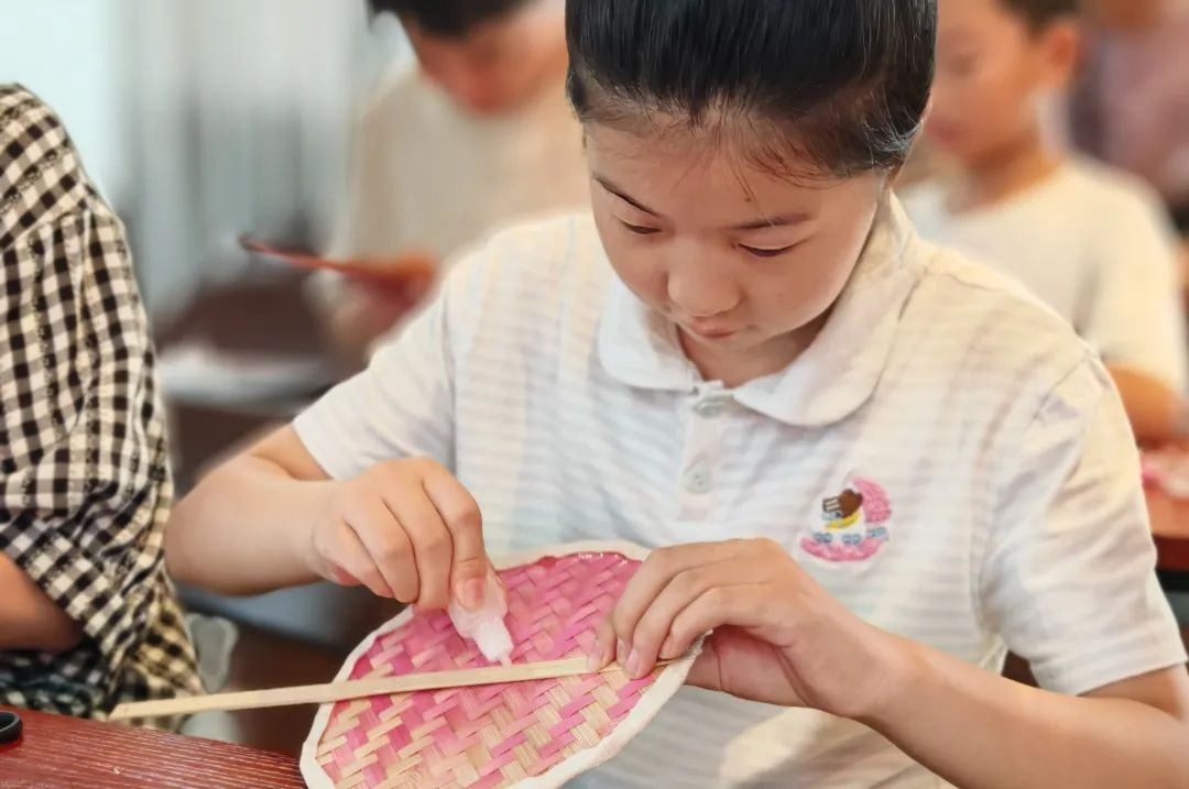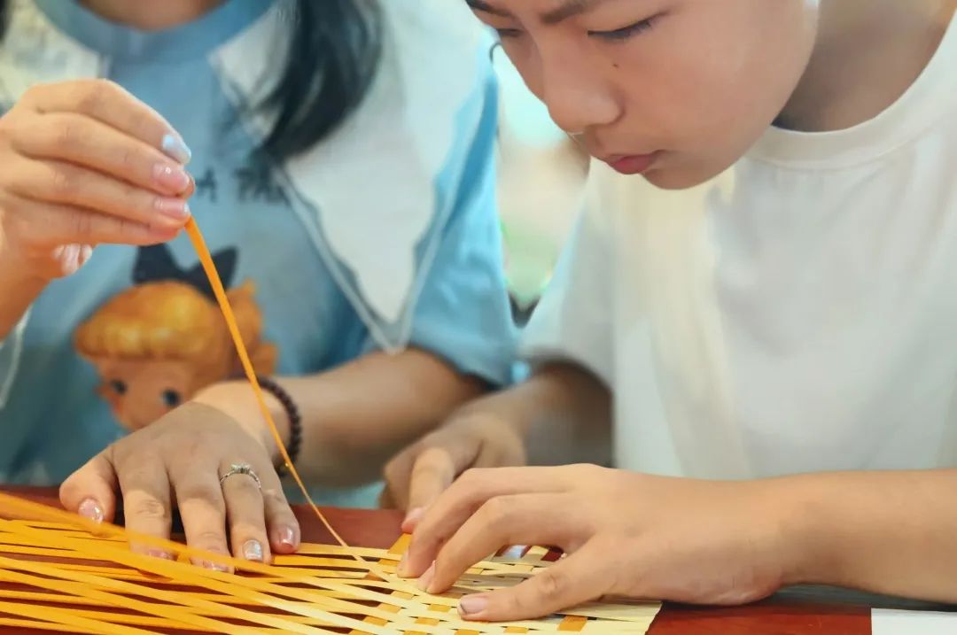 知识浸润心灵,实践方得真知。在志愿者的悉心指导下,亲子家庭开始动手编织竹扇。家长与孩子携手合作,指尖小心翼翼地引导着柔韧的竹丝,或挑或压,经纬交错。孩子们全神贯注,家长则在一旁轻声指点,共同克服编织中的细微挑战。活动现场,孩子们的作品可谓千姿百态:有憨态可掬的小动物,有绽放的花朵,还有天马行空的抽象图案。五颜六色的竹丝在他们手中仿佛拥有了生命,不仅考验着手指的灵巧,更是一场关于色彩搭配、形态构思的“指尖美学课”,悄然培育着孩子们对美的感知力与创造力。