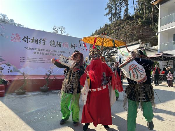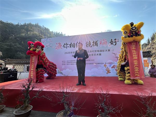 春启徽州,梅香满村。2月9日,歙县雄村镇卖花渔村老村委会门口彩旗飘扬,2026年赏梅摄影大赛暨第十五届徽派盆景艺术展开幕式在此举行。歙县人民政府副县长吴文斌、雄村镇党委书记徐彦、黄山市摄影家协会主席潘成、徽派盆景非遗传承人及各界游客、摄影爱好者齐聚,共赴这场集梅景、非遗、艺术于一体的文旅盛宴。