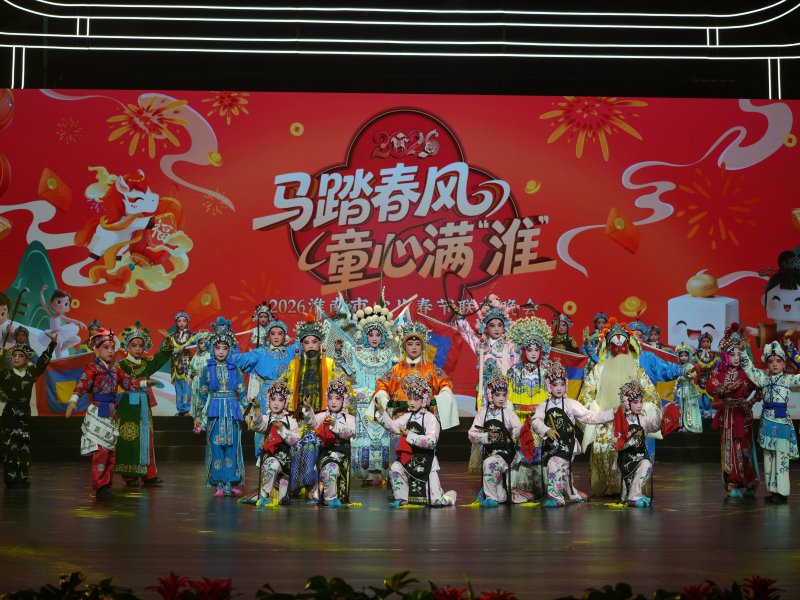 2月10日,安徽省淮南市淮南剧院,小演员们在少儿春晚上表演节目。当晚,淮南市举行“马踏春风童心满‘淮’ ”少儿春节联欢晚会,孩子们载歌载舞,喜迎新春佳节。