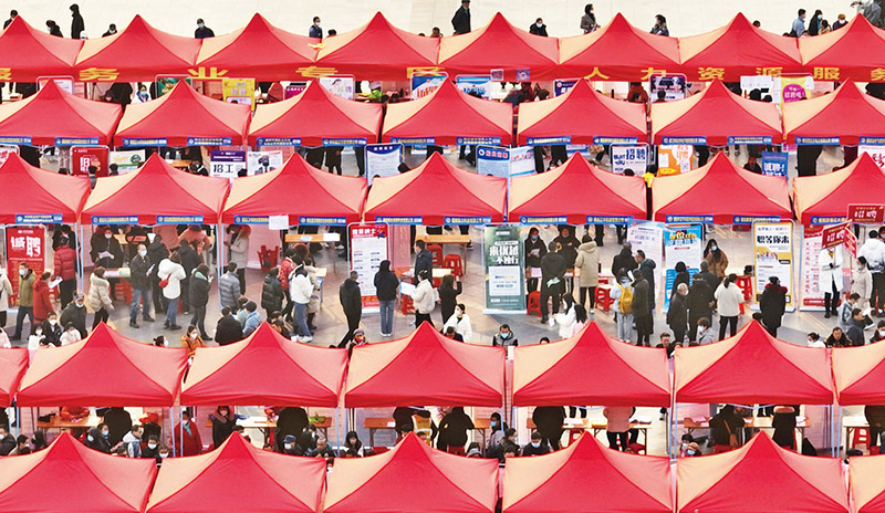 新春伊始,各地举行人才招聘会,吸引众多求职者前来应聘。图为2023年2月1日,求职者在湖北襄阳人民广场举行的招聘会上了解岗位情况。 新华社发 谢勇/摄