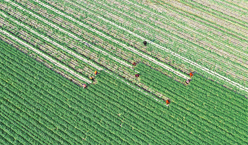 近年来,四川省南充市蓬安县积极引导沿江群众将荒置河滩地进行开垦改良,发展蔬菜种植业,带动农业增效、农民增收。图为2023年1月31日,蓬安县锦屏镇中坝社区沿江蔬菜种植基地里,菜农们正忙着采收萝卜。 人民图片 周亮/摄