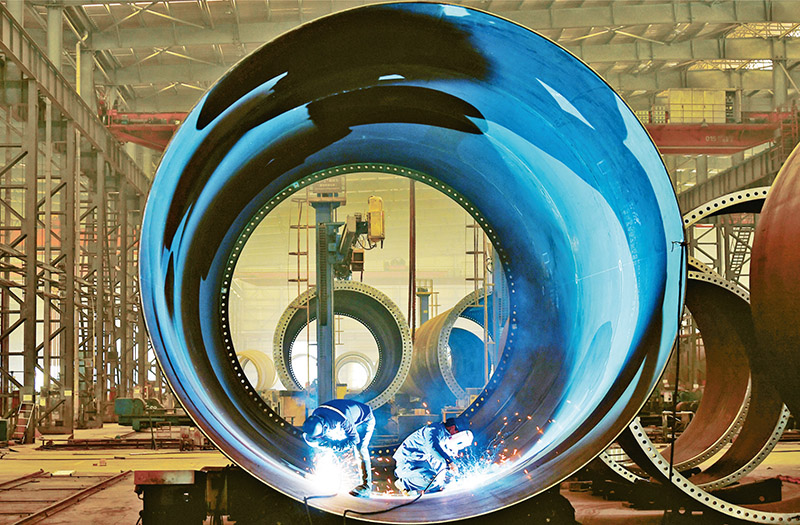 图为2023年2月8日,江苏省太仓港经济技术开发区,苏州天顺新能源科技有限公司生产人员正在焊接风电塔筒单节筒体,奋力实现首季“开门红”。 人民图片 计海新/摄