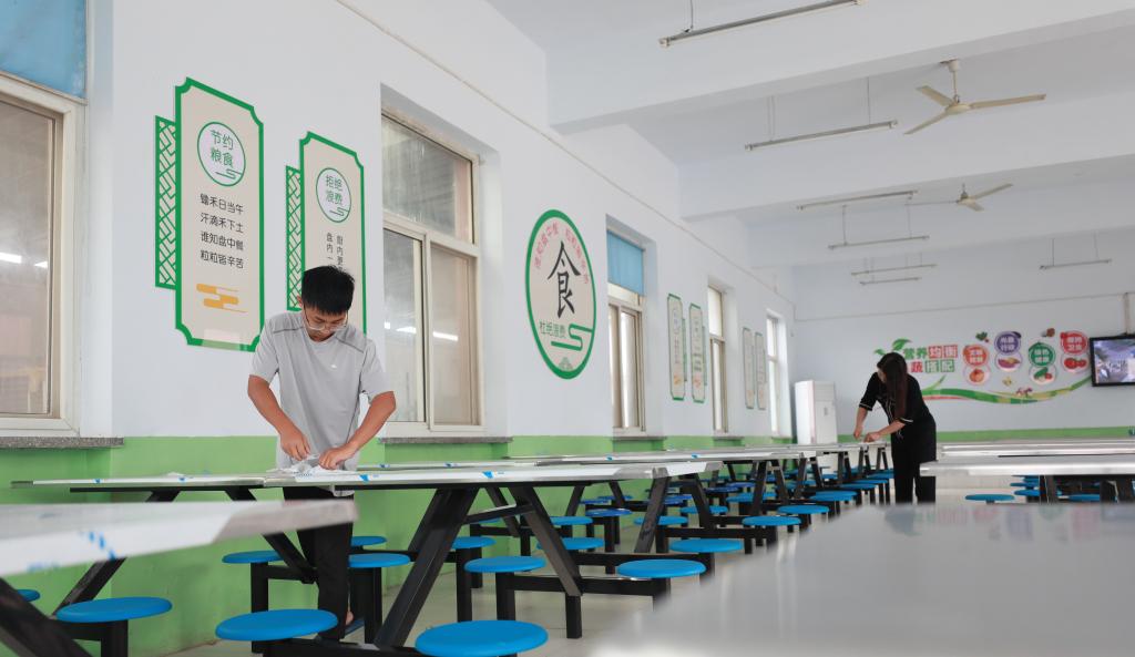 邢台市任泽区骆庄乡达二小学重新修复后焕然一新的食堂,教职工为秋季开学做最后准备。新华社记者任丽颖 摄