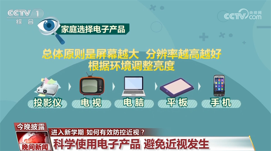 如今,学习和生活都离不开电子产品,学校和家庭选择电子产品有哪些要求,如何正确使用呢?研究认为,视屏类电子产品的屏幕亮度、环境亮度、观看距离和暴露时间是影响儿童青少年视力的主要因素。家庭选择电子产品,建议使用次序为投影仪、电视、电脑、平板、手机。总体原则是屏幕越大,分辨率越高越好,根据环境调整亮度。周围环境较暗时,要打开房间灯光照明,避免在过暗的环境下使用电子产品。电视的观看距离不小于屏幕对角线距离的4倍,电脑的水平观看距离不小于50厘米,手机的观看距离不小于40厘米。