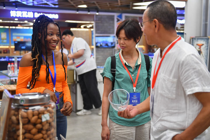 6月30日,在中非经贸合作促进创新示范园(湖南高桥大市场),来自贝宁的志愿者米贝拉(左一)向参观者介绍展品。