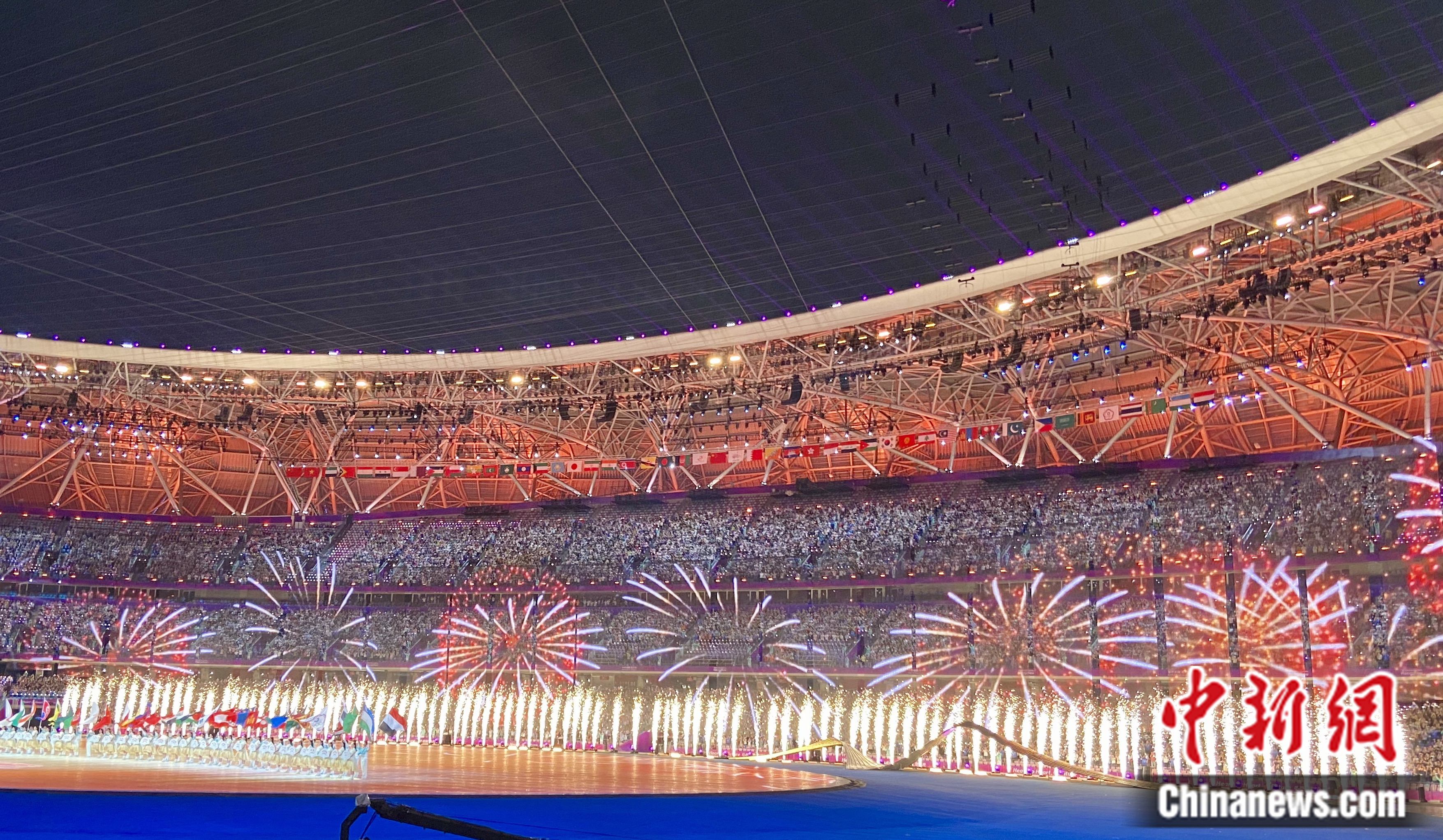 中新社杭州9月24日电 (方堃 项菁)看得见数字烟花、听得见钱江潮水、闻得到桂花香气……23日晚,钱塘江两岸灯光照耀古今,杭州第19届亚运会开幕式多项环节“刷新”亚运史。