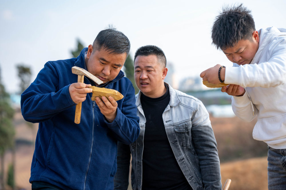 2024年2月22日,云南澄江化石地世界自然遗产博物馆副馆长郭进(左一)和同事在云南省澄江市黑蟆地查看采集到的化石标本。