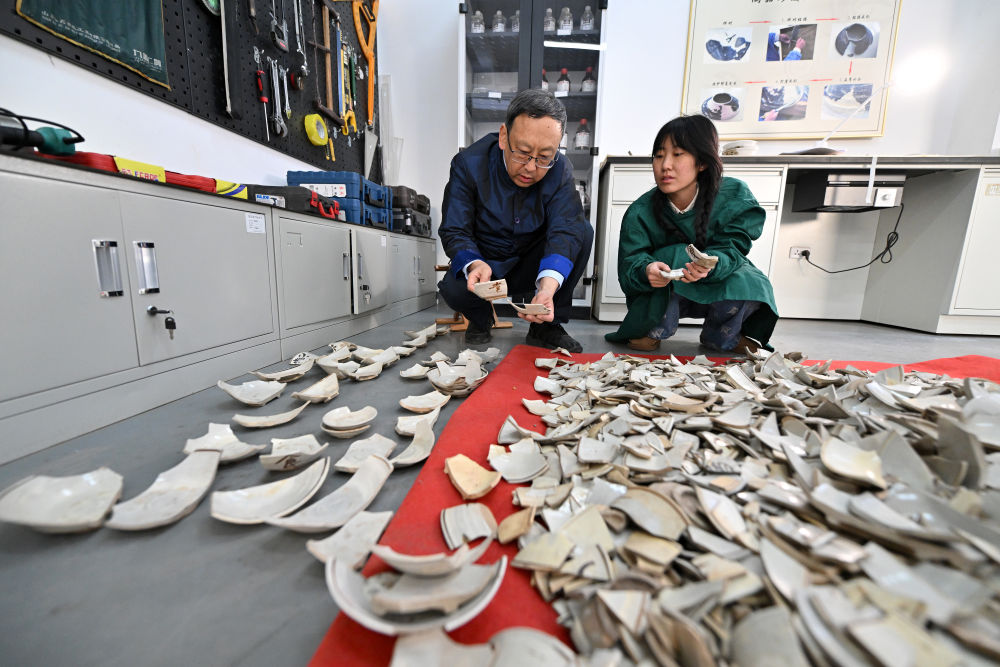 2024年2月23日,在中国社会科学院考古研究所安阳工作站,工作人员在整理修复殷墟洹北商城出土的陶片。