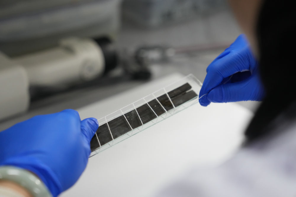 2024年3月4日,工作人员在湖南省文物考古研究院长沙铜官窑基地封护简牍。