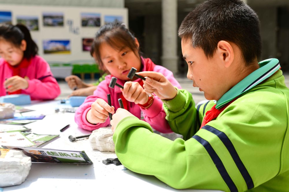 2024年4月22日,内蒙古自治区鄂尔多斯市康巴什区实验小学在康巴什自然博物馆开展“探索自然奥秘 保护地球家园”主题研学活动,这是学生在研学课程中体验寻找动物化石。