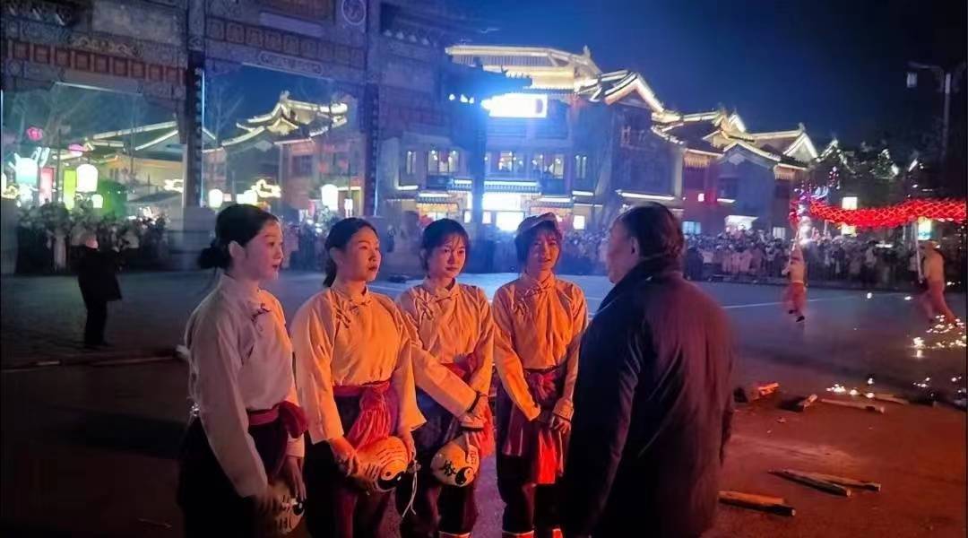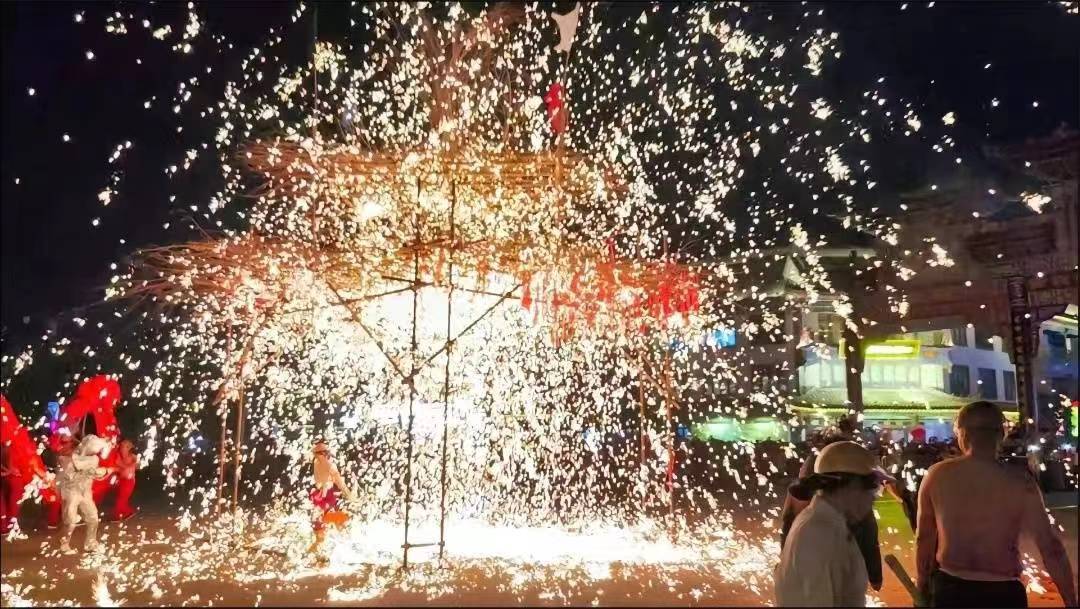 在进行了成千上万次的训练后 她们终于在柳枝花棚下 把1600℃的铁水打成漫天华彩 一勺勺铁水化作一朵朵铁花 在天空中璀璨绽放