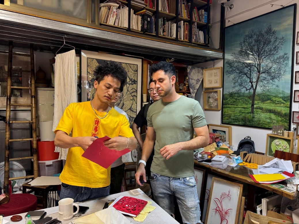 跟随采访团走访的委内瑞拉籍自媒体人Rafael走进一家漳浦剪纸店,和店主黄际宇体验剪纸。Rafael表示,体验当地的文化,很有意思。