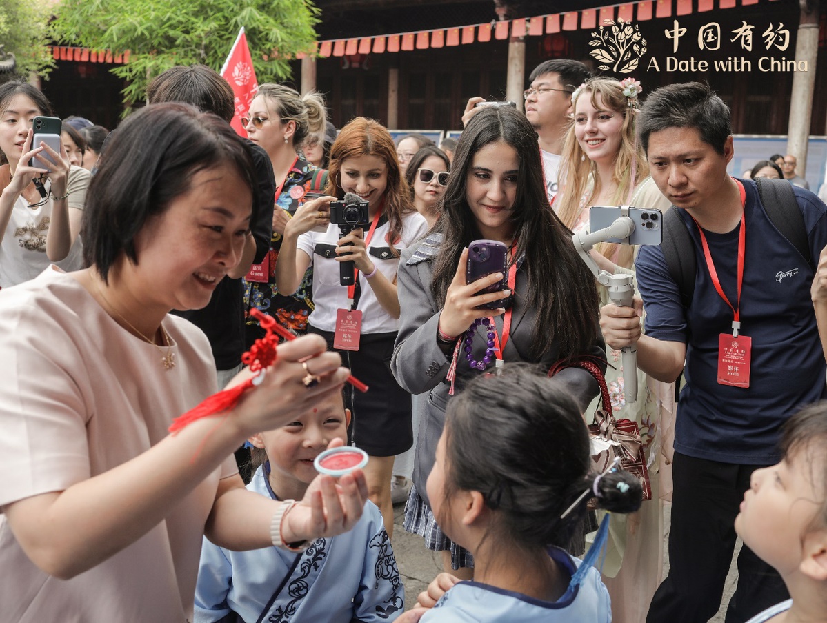采访团在文庙观看开笔礼,老师正在用朱砂在孩子的额头上点痣,也即“朱砂开智”,是开笔礼的一个环节,寓意孩子眼明心明