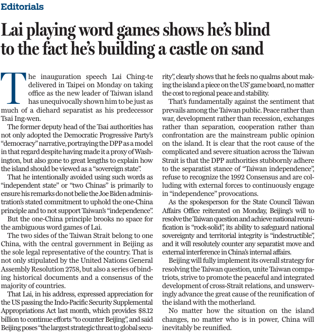 原文标题:Lai playing word games shows he's blind to the fact he's building a castle on sand