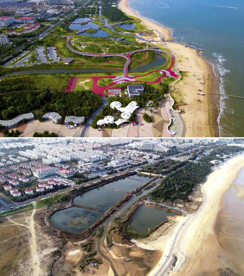 ??这是一张拼版照片,上图为2021年拍摄的生态修复完成后的山东日照市阳光海岸绿道,该绿道长28公里(无人机照片);下图为2019年11月拍摄的日照市阳光海岸绿道未经生态修复时的样子。新华社记者 郭绪雷 摄