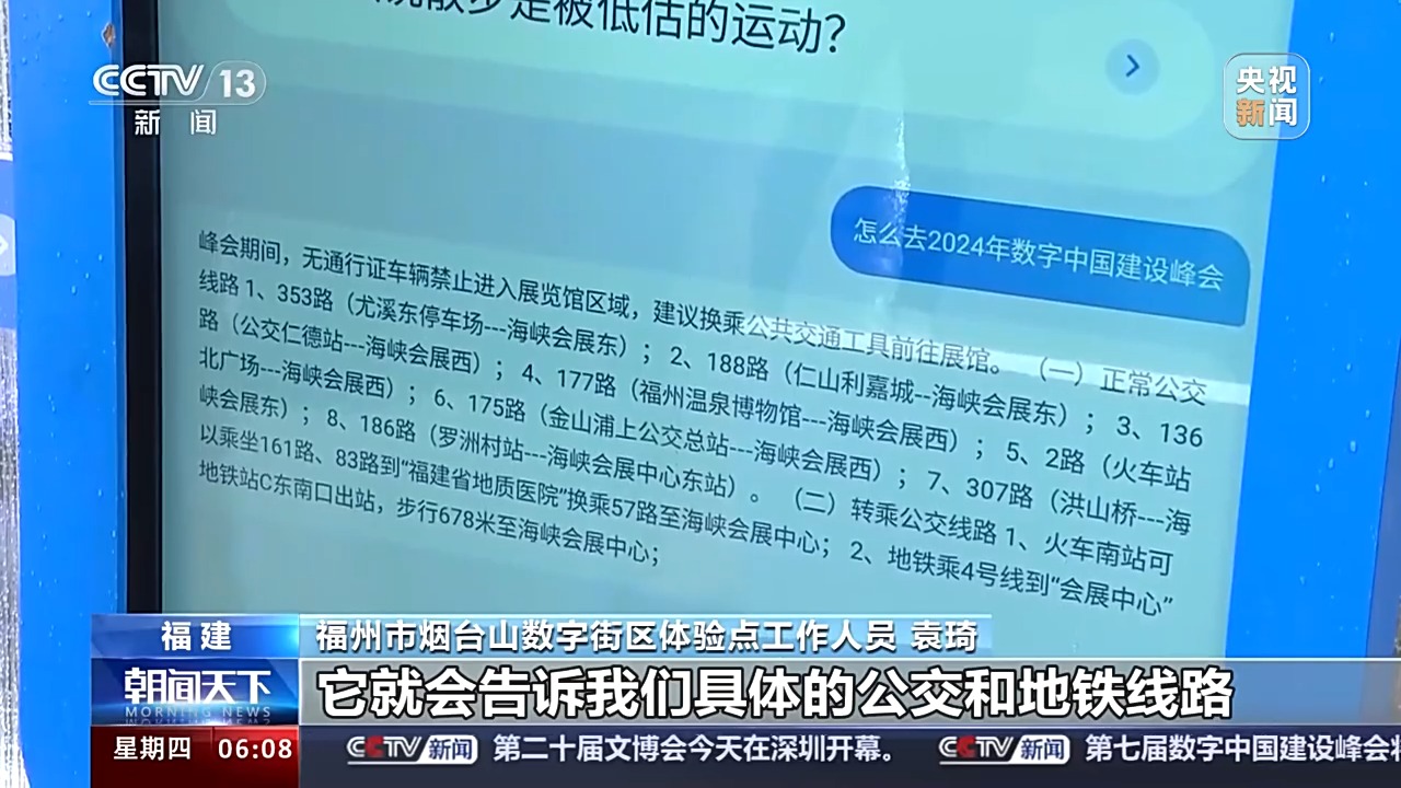 福州市烟台山数字街区体验点工作人员 袁琦:我们现在在数字街区的体验点,主要是让大家体验AI的各类应用和服务。比如我们现在要去数字峰会的现场,跟智能助理说一句怎么走,它就会告诉我们具体的公交和地铁线路,同时能帮我们一键调取地铁、公交码,我们就能更方便地扫码乘车了。