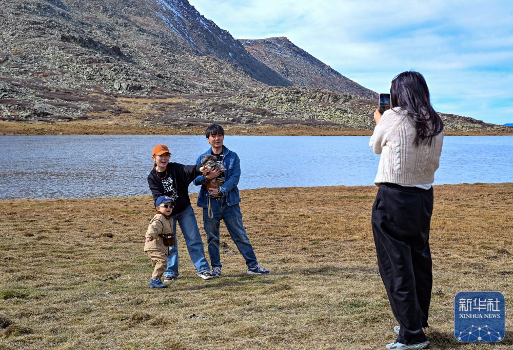 10月2日,游客在新疆阿勒泰阿禾公路沿线的通巴天鹅湖边打卡拍照。新华社记者 陈朔 摄