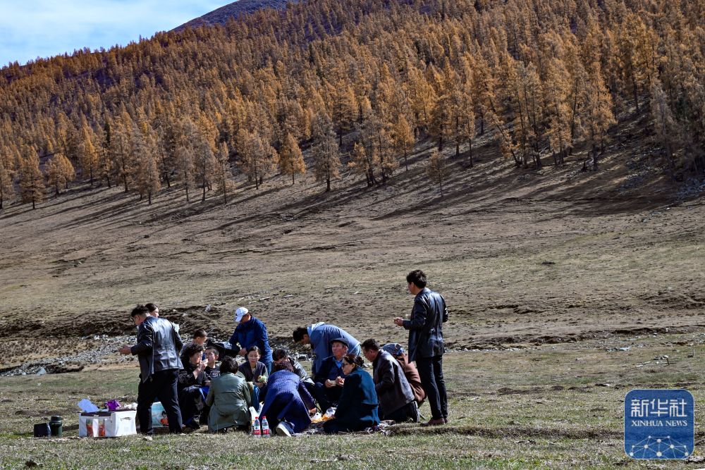 10月2日,游客在新疆阿勒泰禾木村游玩。 新华社记者 陈朔 摄
