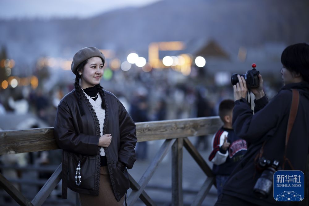 10月2日,游客在新疆阿勒泰禾木村打卡拍照。新华社记者 陈朔 摄